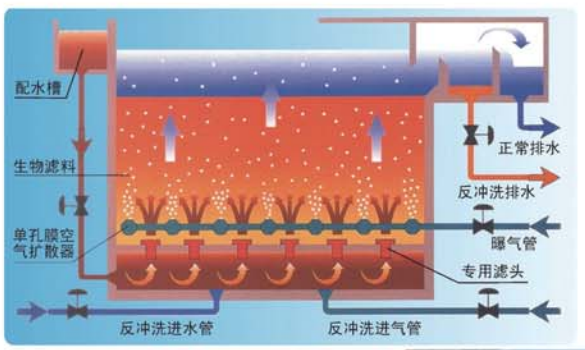 曝氣生物濾池(Biological Aerated Filter簡稱BAF)是上世紀八十年代末法國研制成功的污水處理新工藝,屬第三代生物膜反應器,不僅具有生物膜工藝技術(shù)的優(yōu)勢,同時也起著有效的空間過濾作用。其基本原理是在一級處理基礎上,以顆粒狀填料及其附著生長的生物膜為處理介質(zhì),充分發(fā)揮生物代謝作用、物理過濾作用、膜及膜和填料的物理吸附作用以及反應器內(nèi)食物多級捕食作用,實現(xiàn)污染物在同一單元反應器內(nèi)去除。通過使用特殊的濾料和正確的配氣設計,使其與傳統(tǒng)處理工藝相比具有優(yōu)異的工藝性能。